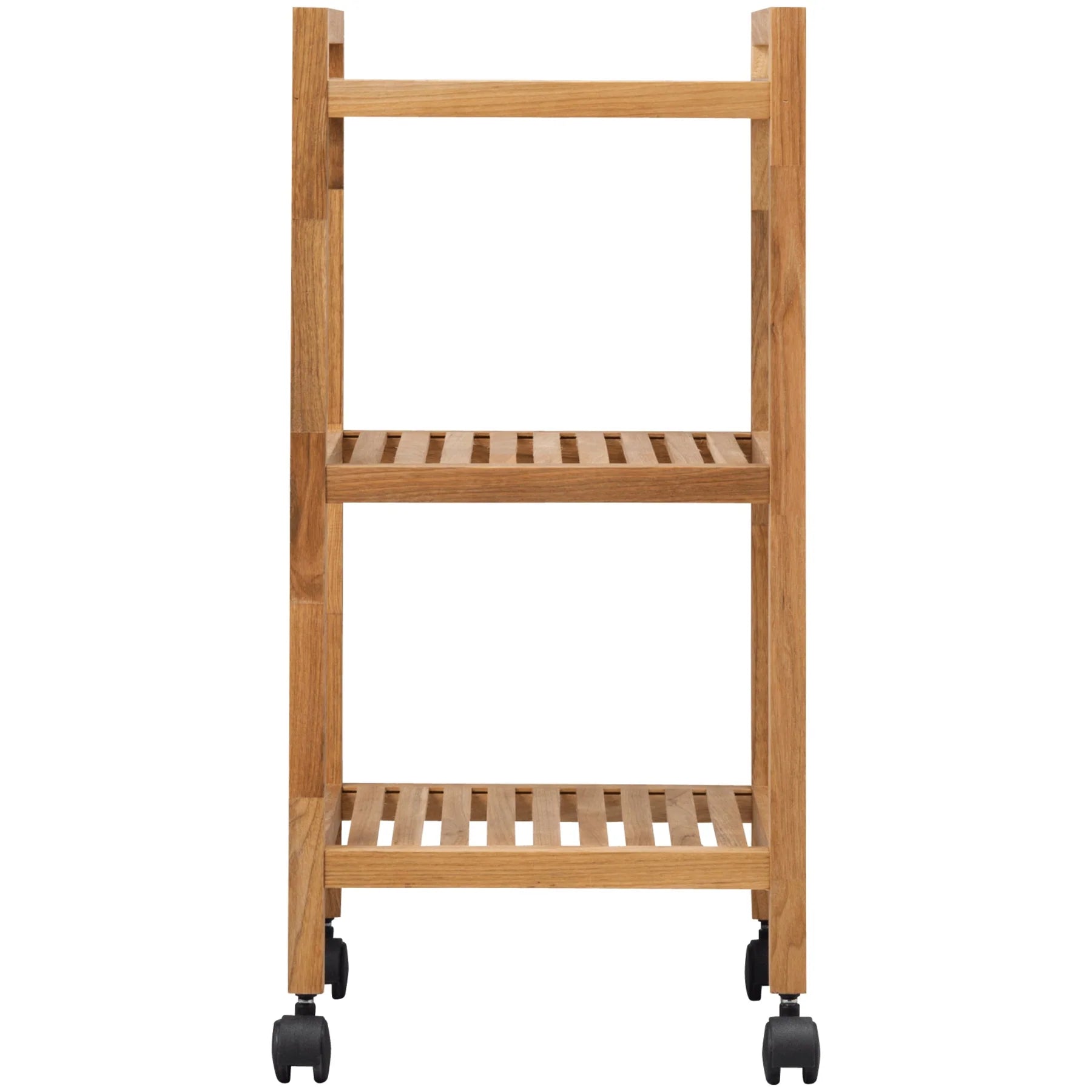 This wooden storage cart is easy to move. Its simple design and compact size make it perfect for living rooms, dining rooms, and other indoor spaces.